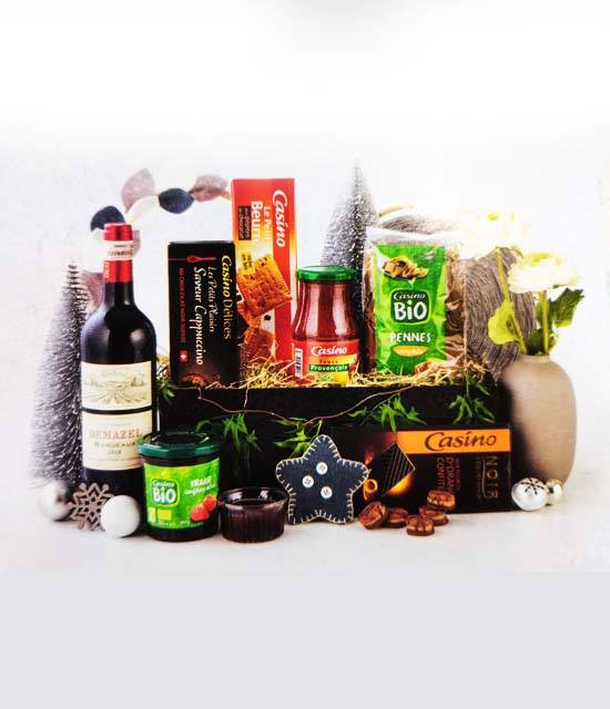 Products Includes : Red Wine Cappuccino Biscuits 100g, Penne pasta Whole meal 500g, Provençale sauce 420g, Casino bio strawberry jam 360g, chocolate filled orange 100g, Biscuit Choco 200g Box Gift included